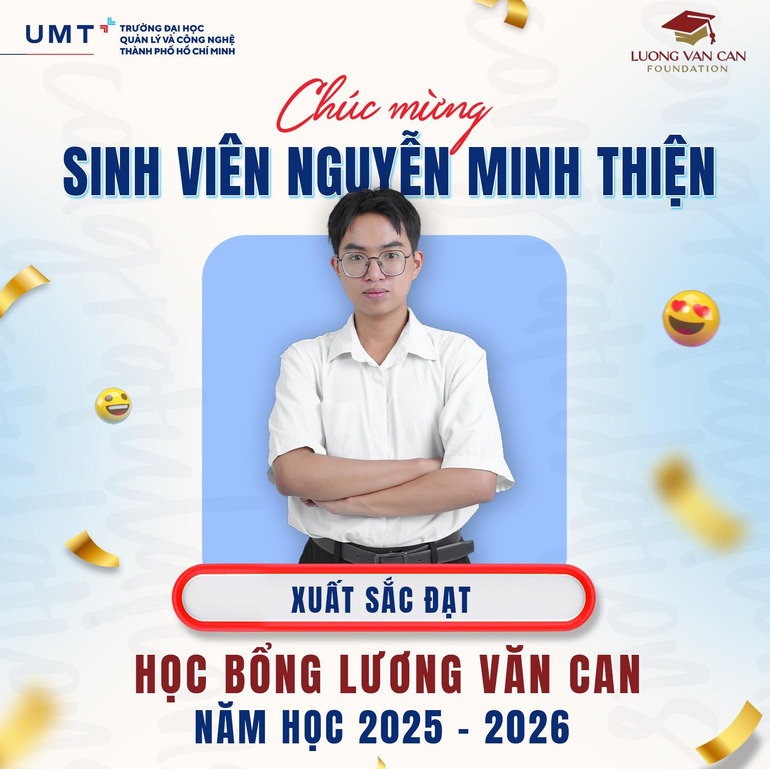 Năm học 2025 - 2026, sinh viên Nguyễn Minh Thiện - Khóa 2, ngành Truyền thông đa phương tiện UMT đã xuất sắc duy trì và tiếp tục nhận học bổng Lương Văn Can, với mức hỗ trợ lên đến 100% học phí năm học.