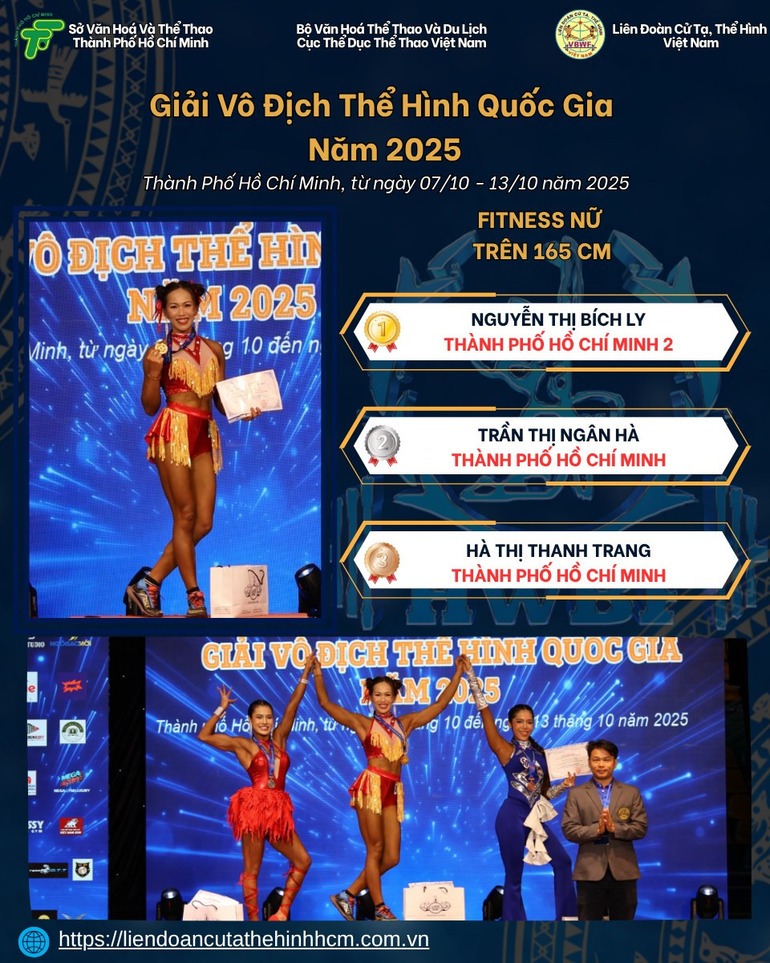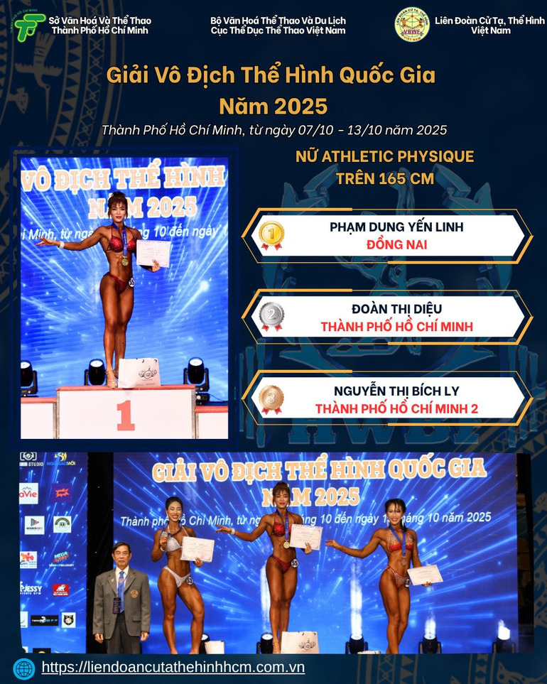 Giải Vô địch Thể hình Quốc gia được tổ chức dưới sự phối hợp của Sở Văn hóa và Thể thao TP.HCM và Liên đoàn Cử tạ - Thể hình Việt Nam. Năm 2025, Giải đấu quy tụ gần 150 vận động viên từ 13 tỉnh/thành, tranh tài trong 33 hạng mục đa dạng ở các nội dung Bodybuilding, Fitness và Athletic Physique.