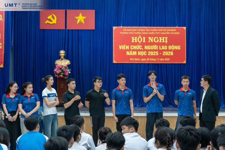 Trong chuỗi hoạt động tư vấn và hướng nghiệp mùa tuyển sinh, Trường Đại học Quản lý và Công nghệ TP.HCM (UMT) đã có buổi gặp gỡ, giao lưu ý nghĩa cùng học sinh Trường THPT Nguyễn Thị Định và Trường THPT Năng khiếu Thể dục Thể thao Nguyễn Thị Định (TP.HCM). Chương trình không chỉ mang đến thông tin tuyển sinh hữu ích mà còn truyền cảm hứng mạnh mẽ về định hướng nghề nghiệp trong tương lai cho các bạn trẻ.