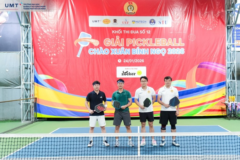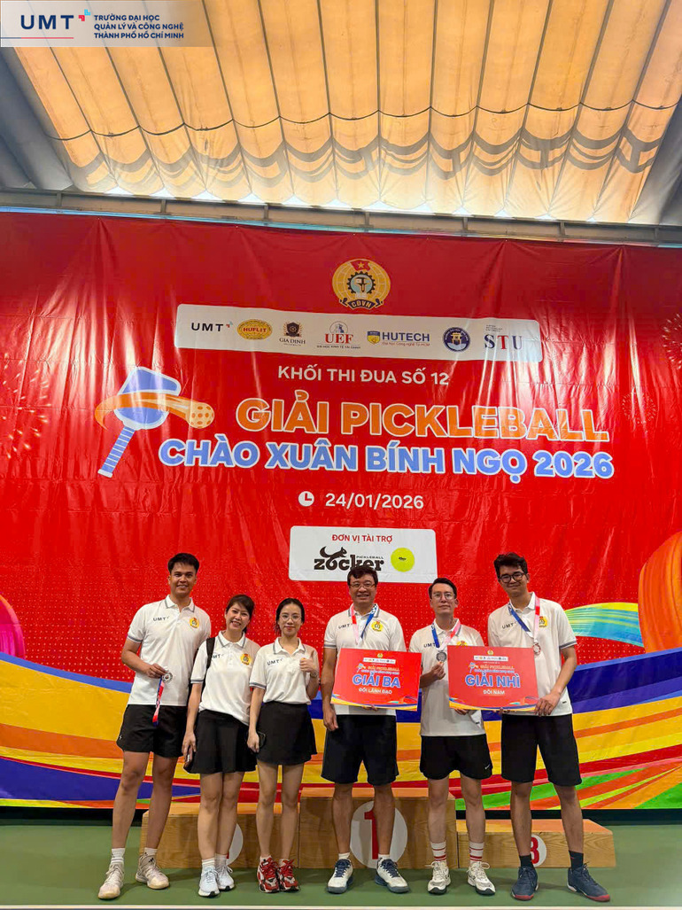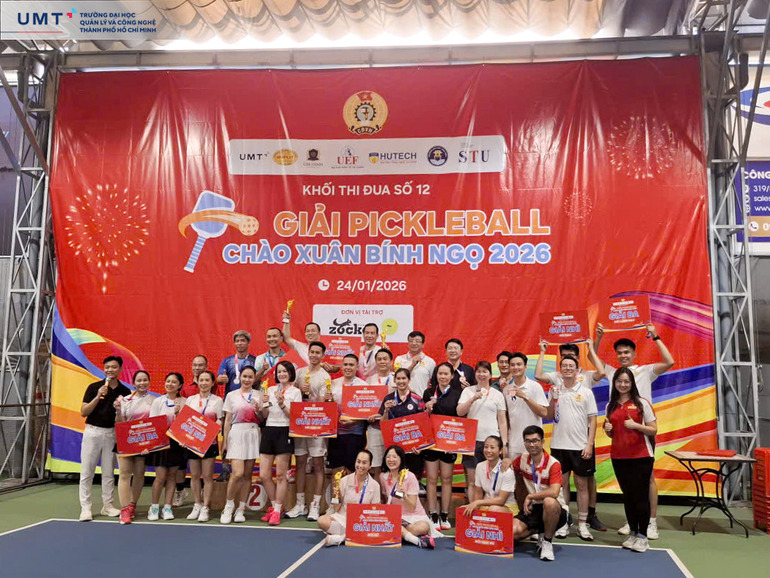 Công đoàn Cơ sở Trường Đại học Quản lý và Công nghệ TP.HCM (UMT) đã tích cực tham gia Giải Pickleball Chào Xuân Bính Ngọ 2026 - giải đấu giao lưu thể thao giữa 7 trường Đại học thuộc Khối thi đua số 12, diễn ra trong không khí sôi nổi, hào hứng chào Xuân mới.