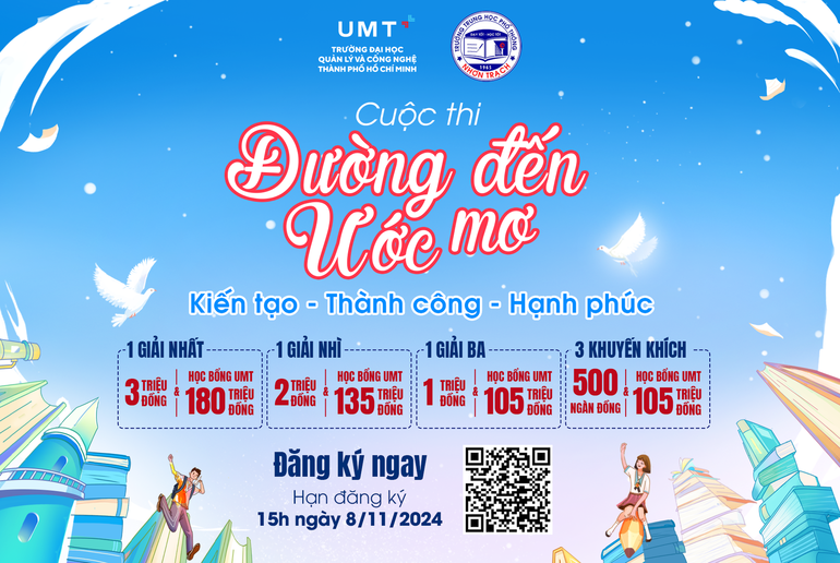 Trường Đại học Quản lý và Công nghệ TP.HCM (UMT) tổ chức Cuộc thi “ĐƯỜNG ĐẾN ƯỚC MƠ 2024” với mong muốn mang đến cho học sinh THPT một sân chơi nhằm thử thách bản thân, khám phá tiềm năng và hiện thực hóa những dự án đóng góp cho cộng đồng. Cuộc thi cũng hướng tới việc phát triển toàn diện với nền tảng tư duy đa chiều, tinh thần khai phóng và những kỹ năng cần thiết giúp các bạn thích nghi với cuộc sống hiện đại đầy biến động. Đồng thời, đây cũng là cơ hội để các bạn kết nối và giao lưu với chuyên gia, giảng viên, nhân viên cùng sinh viên UMT; giúp hiểu hơn về Trường, ngành đào tạo và định hướng nghề nghiệp trong tương lai.