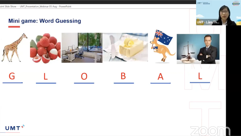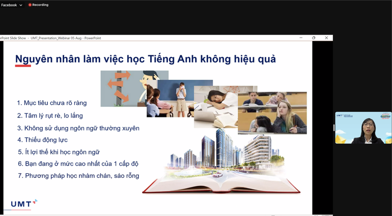Tiếng Anh chính là công cụ để các bạn trở thành công dân toàn cầu, nhưng rất nhiều bạn học sinh chưa tìm được phương pháp học Tiếng Anh hiệu quả. Do đó, ngày 5/8/2022, Trường Đại học UMT đã tổ chức Webinar trực tuyến trên Zoom và livestream trên Fanpage để giúp các tân sinh viên có bí quyết học tập và cải thiện Tiếng Anh khi lên đại học.