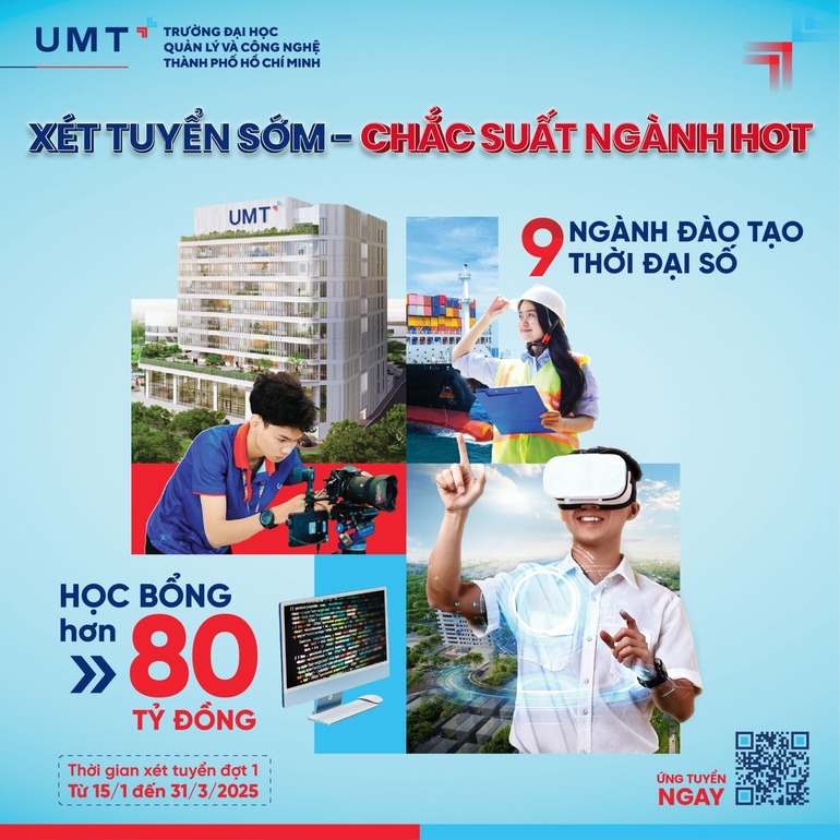 Từ nay đến hết ngày 31/3/2025, Trường Đại học Quản lý và Công nghệ TP.HCM chính thức mở cổng đăng ký học bổng sớm. Các bạn thí sinh yêu mến, quan tâm tìm hiểu các ngành đào tạo tại UMT, đừng bỏ lỡ cơ hội “vàng” này nha.